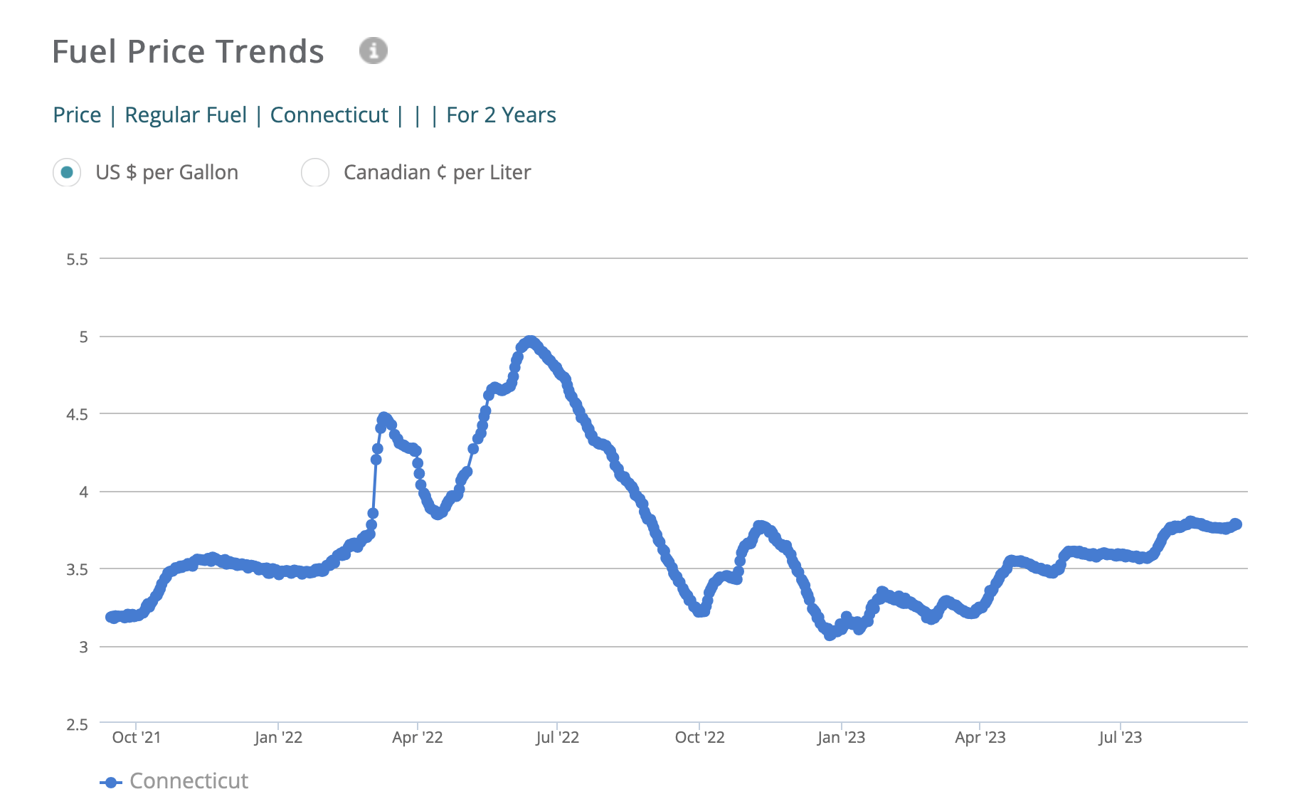 According to data gathered by the crowdsourced website GasBuddy, the average cost per gallon of gasoline in Connecticut as of Sept. 14 is $3.778. This figure reflects a decrease of $0.023 in comparison to the highest price recorded this year, which was $3.801 per gallon on August 15.