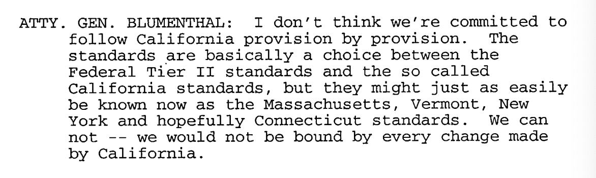 Blumenthal’s response to Rep. Piscopo was: “I don’t think that we’re committed to follow California provision by provision. The standards are basically a choice between the Federal Tier II and the so-called California standard.”