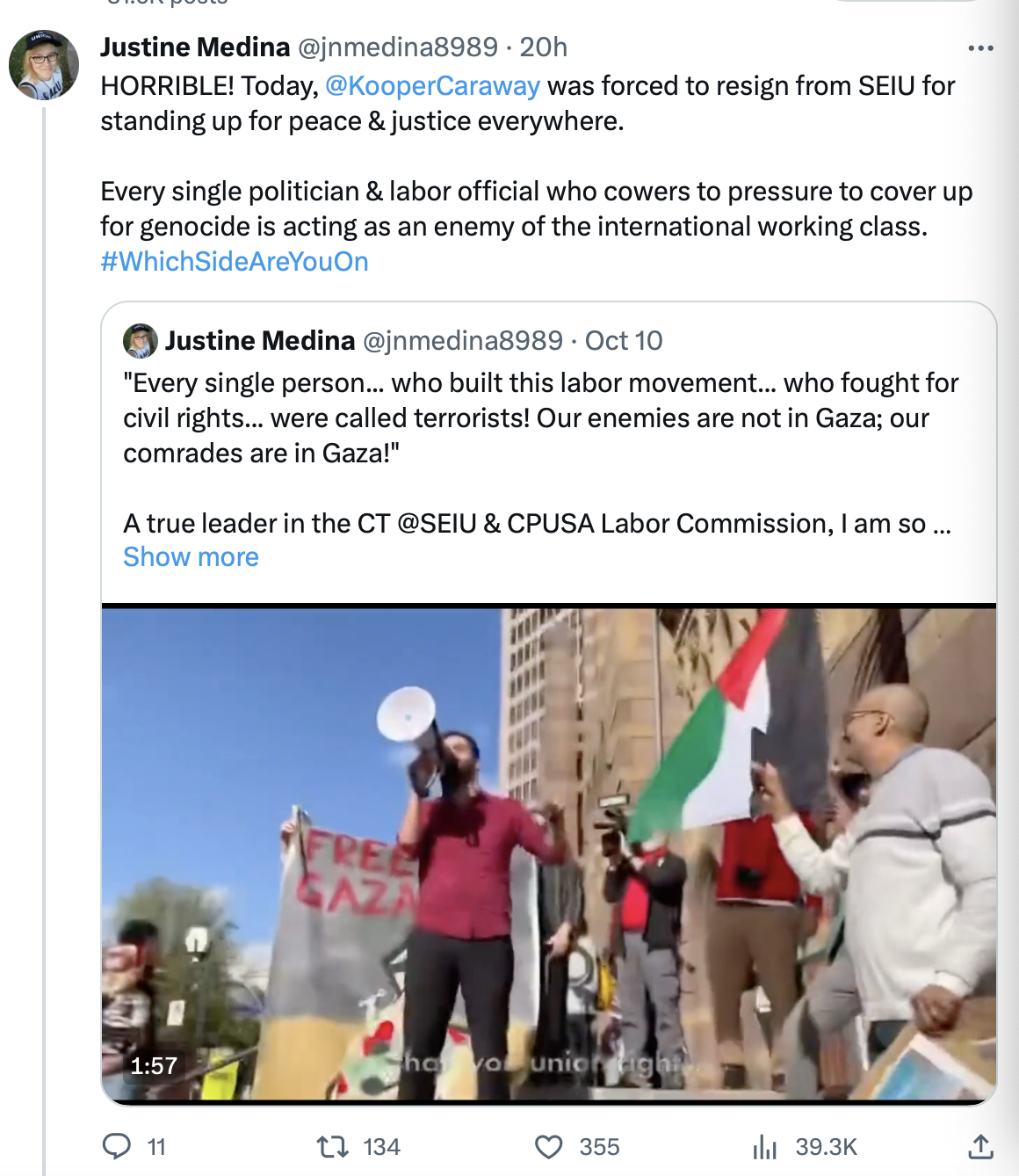 Following Caraway’s resignation Medina took to social media calling the situation, “horrible!” and that “every single politician and labor official who cowers to pressure to cover up for genocide is acting as an enemy of the international working class. #WhichSideAreYouOn.”