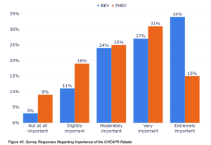 More than one-third of BEV respondents stated that the rebates were only moderately, slightly or not important at all in their purchasing decision. Similarly, more than half of those who purchased PHEVs reported that the rebates fell into these same categories in influencing their decision.