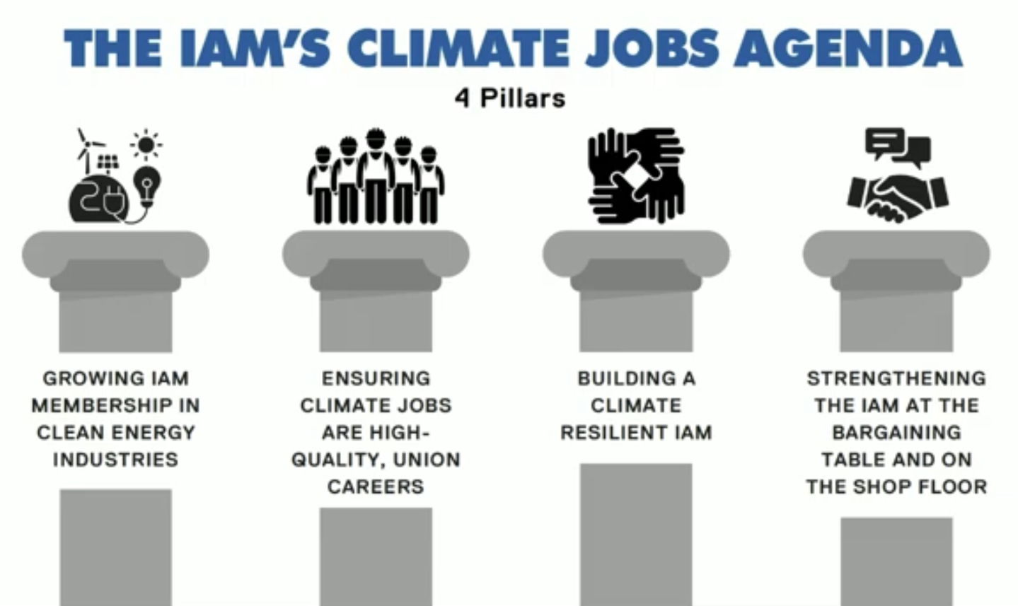The IAM’s plan is laid out in four pillars: growing membership in clean energy industries; ensuring every new climate job is a union job; building a “climate resilient” IAM; and flexing their muscle at the bargaining table.