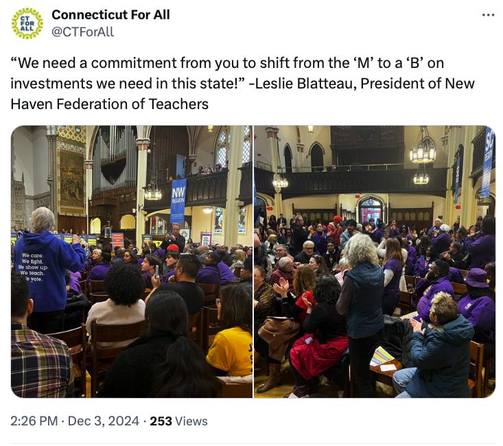 Connecticut For All, a coalition of unions and special interest groups, hosted a town hall discussion on Tuesday (Dec. 3), at Christ Church Cathedral in Hartford, demanding legislative action to overhaul the state’s fiscal guardrails and clear the way for billions in new spending.