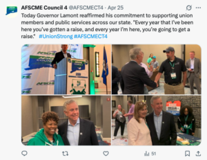 Speaking to nearly 200 union members gathered at AFSCME’s “Rise Up Connecticut & Organize” convention at the Mystic Marriott in Groton, Gov. Lamont proudly stated, “Every year that I’ve been here you’ve gotten a raise, and every year I’m here, you’re going to get a raise,” in remarks posted on X.