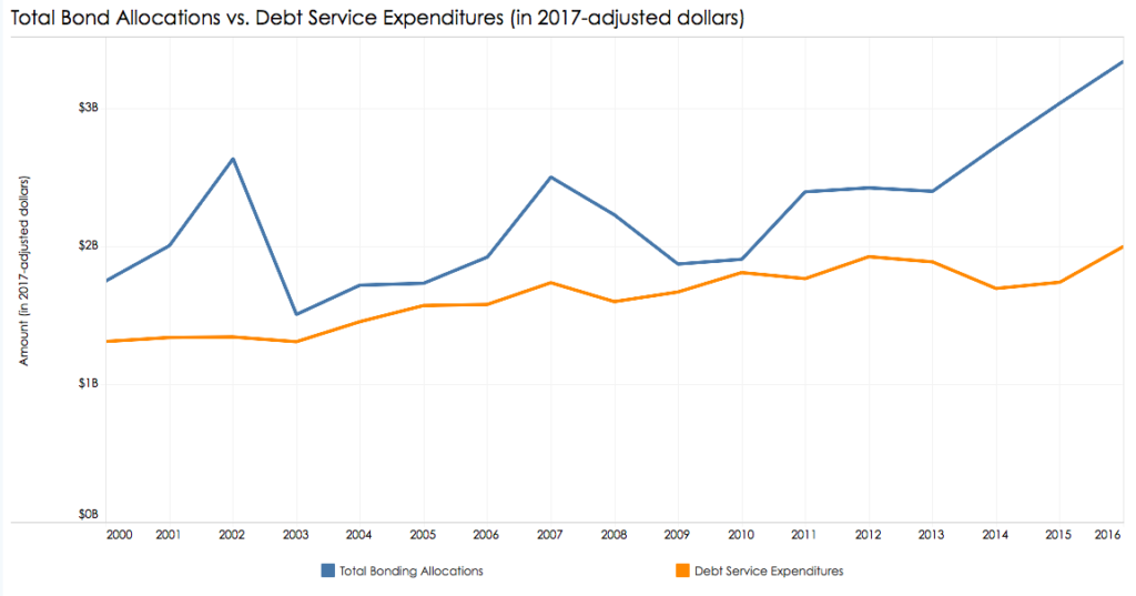 Payments for Connecticut’s debt is one of the fast-growing “fixed costs” which have been driving up government expenses. Connecticut’s bonding has nearly doubled since 2000, and debt service has grown from 1.3 billion to $2 billion during that same time, according to CTStateFinance.org.