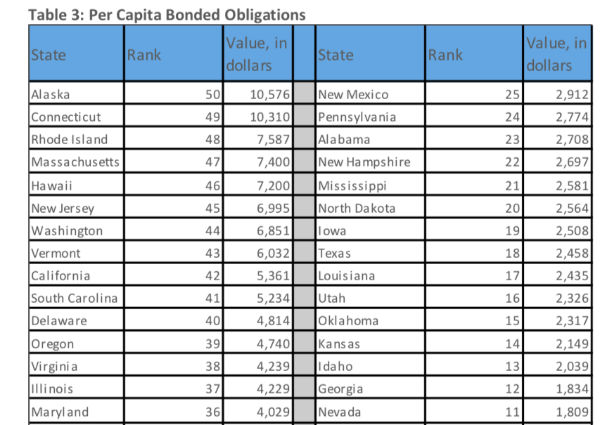 The American Legislative Exchange Council released a study examining the level of bonded debt across the country and found that Connecticut has the second-highest level of bonded debt per person than every other state except Alaska.